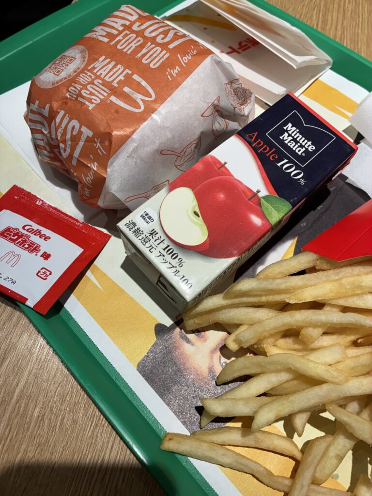 実は私、マックに来るとドリンクでちょっとだけ「健康への免罪符」を求めてしまう癖がありまして。コーラやシェイクの誘惑を振り切り、今回はアップルジュースをチョイスしました。果汁100%という文字を見るだけで、なんだかバランスが取れたような気がしてくるから不思議です。