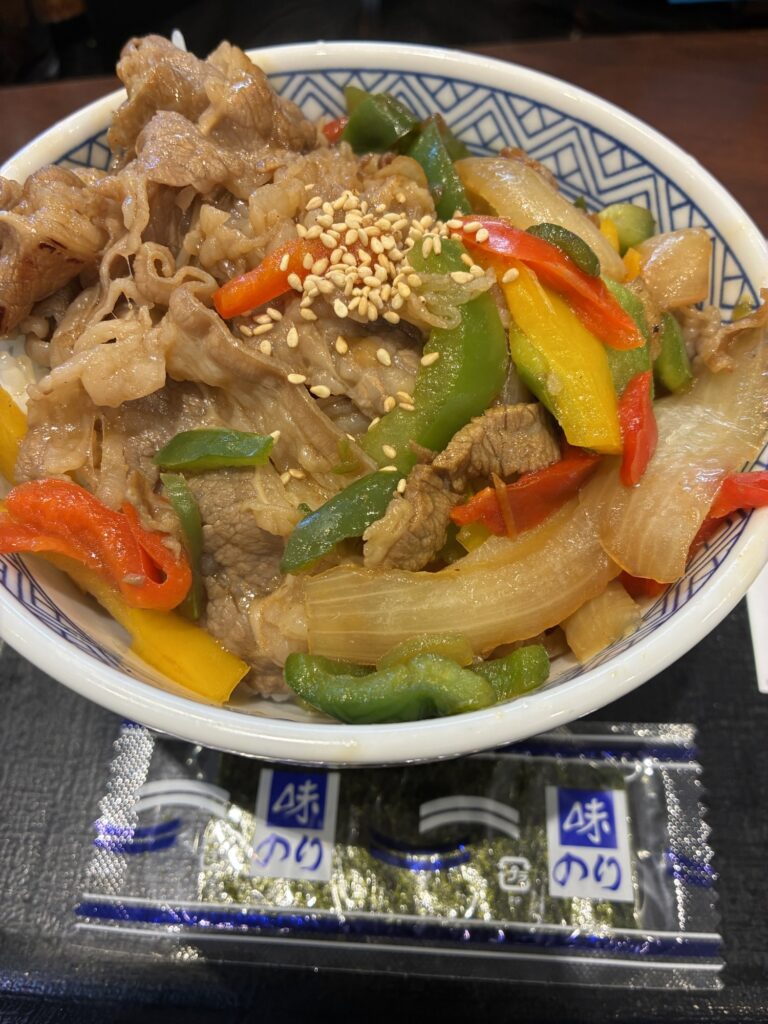 普段の牛丼といえば茶色一色のイメージが強いですが、この牛プルコギ丼はひと味もふた味も違います。赤、黄、緑の3色のピーマンがたっぷりと乗っていて、丼の上がとってもカラフル!ツヤツヤのお肉の茶色とピーマンの鮮やかなコントラストが美しくて、見ているだけでも元気が出てきそうです。上にパラパラっとトッピングされた白ごまも、香ばしさを引き立てるいいアクセントになっています。