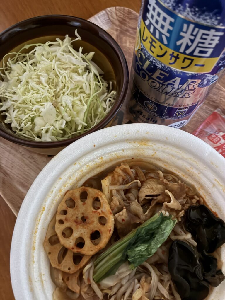 甘くないからこそ、麻辣湯の複雑なスパイスの味を邪魔せず、口の中をスッキリとリセットしてくれる名脇役。さらに、ベジファーストを意識して千切りキャベツ**もしっかり用意しました。これでお酒を飲んでも罪悪感はゼロ……ということにしておきましょうニャ(笑)。