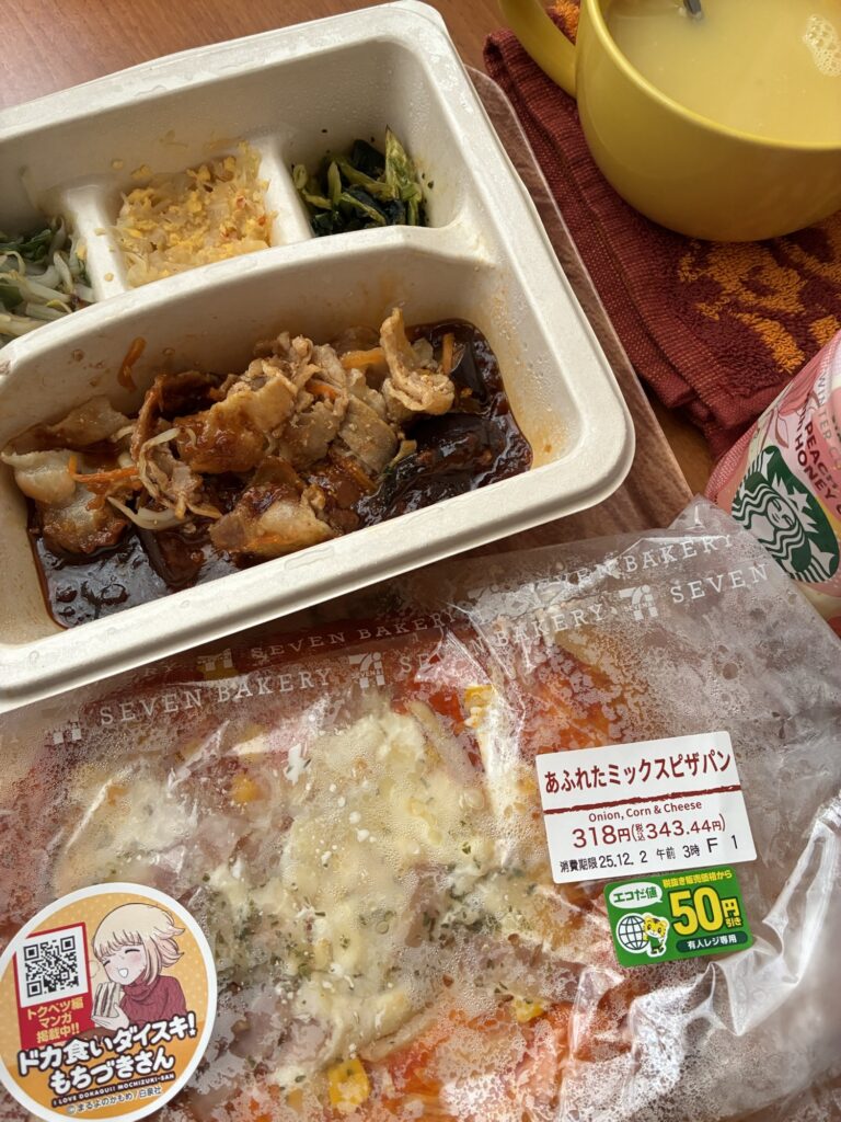 P.S. ちなみに、写真に写っている別のお惣菜(セブンベーカリーのミックスピザ?)は別腹!美味しい誘惑は抗えません…(笑)