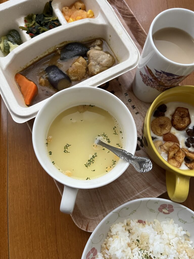 写真にあるように、今日は コンソメ系のスープと、フルーツとナッツ入りのヨーグルトも一緒に。スープで体が温まり、ヨーグルトで腸が喜ぶ組み合わせ。カレーのスパイスが強すぎず優しい味だったので、セットで食べるとちょうどいいバランスになりました。