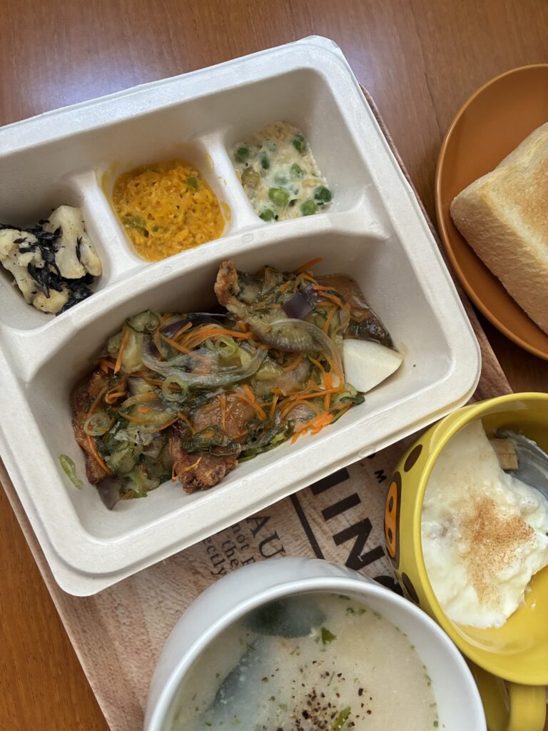 お酢の酸味が強すぎず、絶妙な甘みとのバランスで仕上げられているから、お酢特有のツンとする感じが苦手な人でもとっても食べやすい工夫がされているんだよ。しかも、メインのお皿には柔らかい里芋、トロトロの茄子、彩りの良い人参なんかがゴロゴロ入っていて、お魚と一緒に野菜もたっぷり摂れるのが嬉しいポイントだニャ。