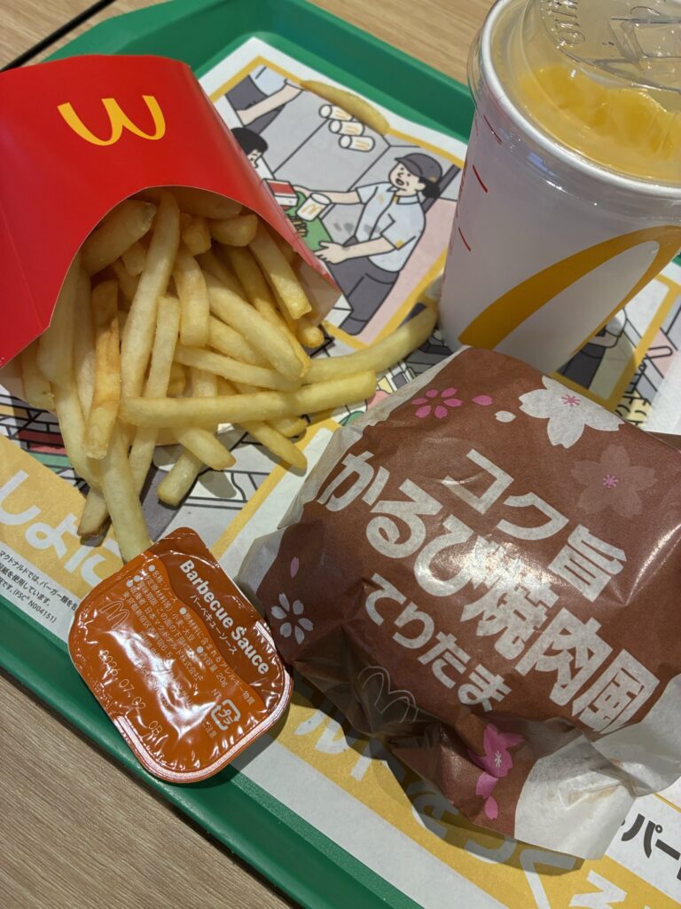 ホクホクのポテトに、スモーキーなバーベキューソースをたっぷりディップ。てりたまの甘辛さとはまた違った刺激が加わって、無限ループに突入しそうな勢いでした。ドリンクはスッキリとオレンジジュースを選んで、口の中をリセットしつつ完食です!